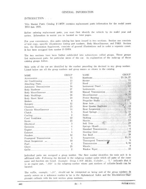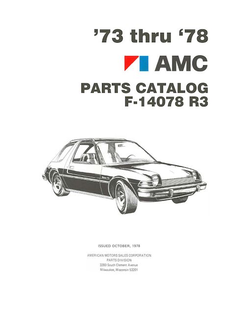 This is the complete 1973 to 1978 American Motors factory parts catalog F-14078, revision 3. The catalog is 1274 pages in one large PDF file, 82.8 MB.