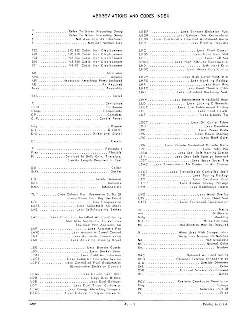 AMC classified all of the parts that go into their cars into Groups. Most groups are unambiguous (e.g. Group 1, Engine) but sometimes you have to get imaginative (e.g. speedometer calibration gears are under “Electrical”) (my interpretation: instrument panel gauges) or just memorize (Rear Suspension is in Group 11 with Springs and Shocks). On the whole it’s well done.