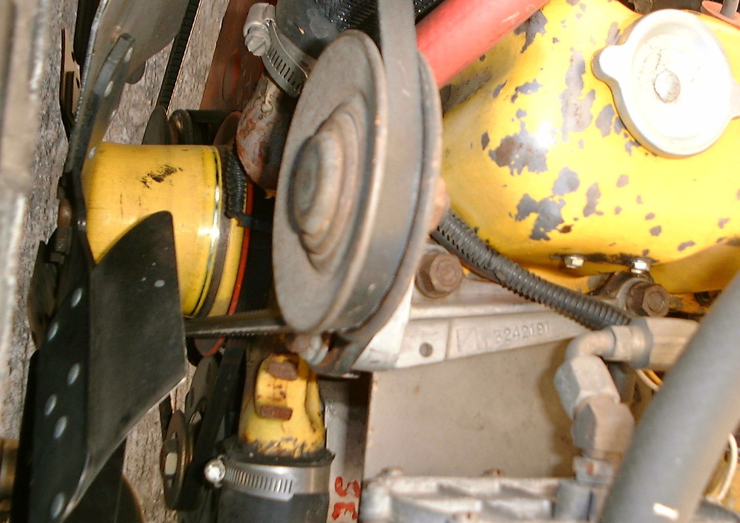 Figuring out how to put the drive V-belt on was a pain, but easy to reproduce. There’s a belt idler/tensioner that you get from an 80’s car that bolts onto the front two head bolts. Sigh, you gotta pull the front head bolt out to install one with a stud end. Get that from the donor. See photos.
