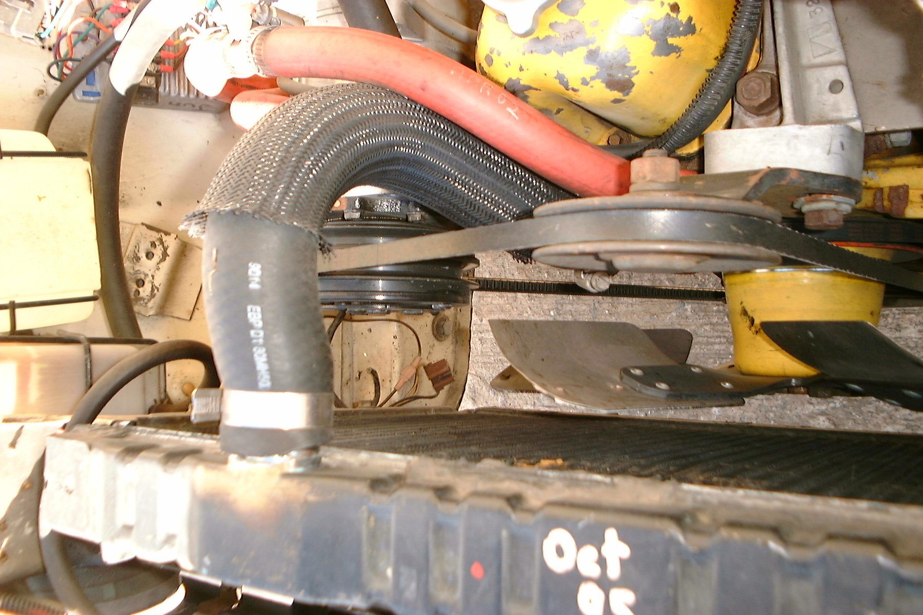 The belt doesn’t clear the upper radiator hose. So I found a new hose that looks like a ? and clears fine. It’s worked great for several years now. I think I used Gates/NAPA 7717. You may need to chop one end shorter. You may have to rig something that works for you.