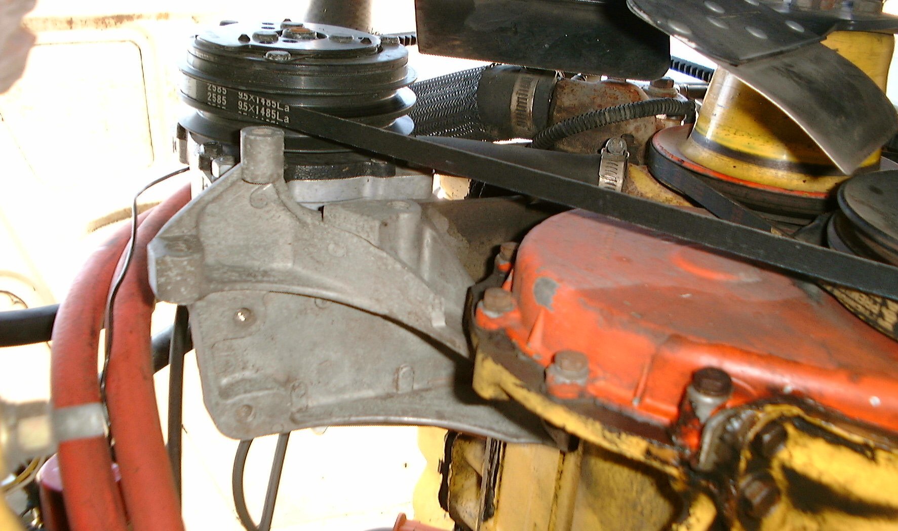 I couldn’t find compressor brackets to fit my engine (pre-1972 AMC 232) so I modified a 1980’s bracket I found in a salvage yard. It would mount an alternator in the newer position too, but I didn’t use that. The bracket attached to the block via three tapped bosses on the left; some time after my engine was made the bottom boss was re-positioned. I had to lop off the bottom of the bracket, and re-drill the hole. I did it on a small mill, but it could easily be done with a hacksaw and file.