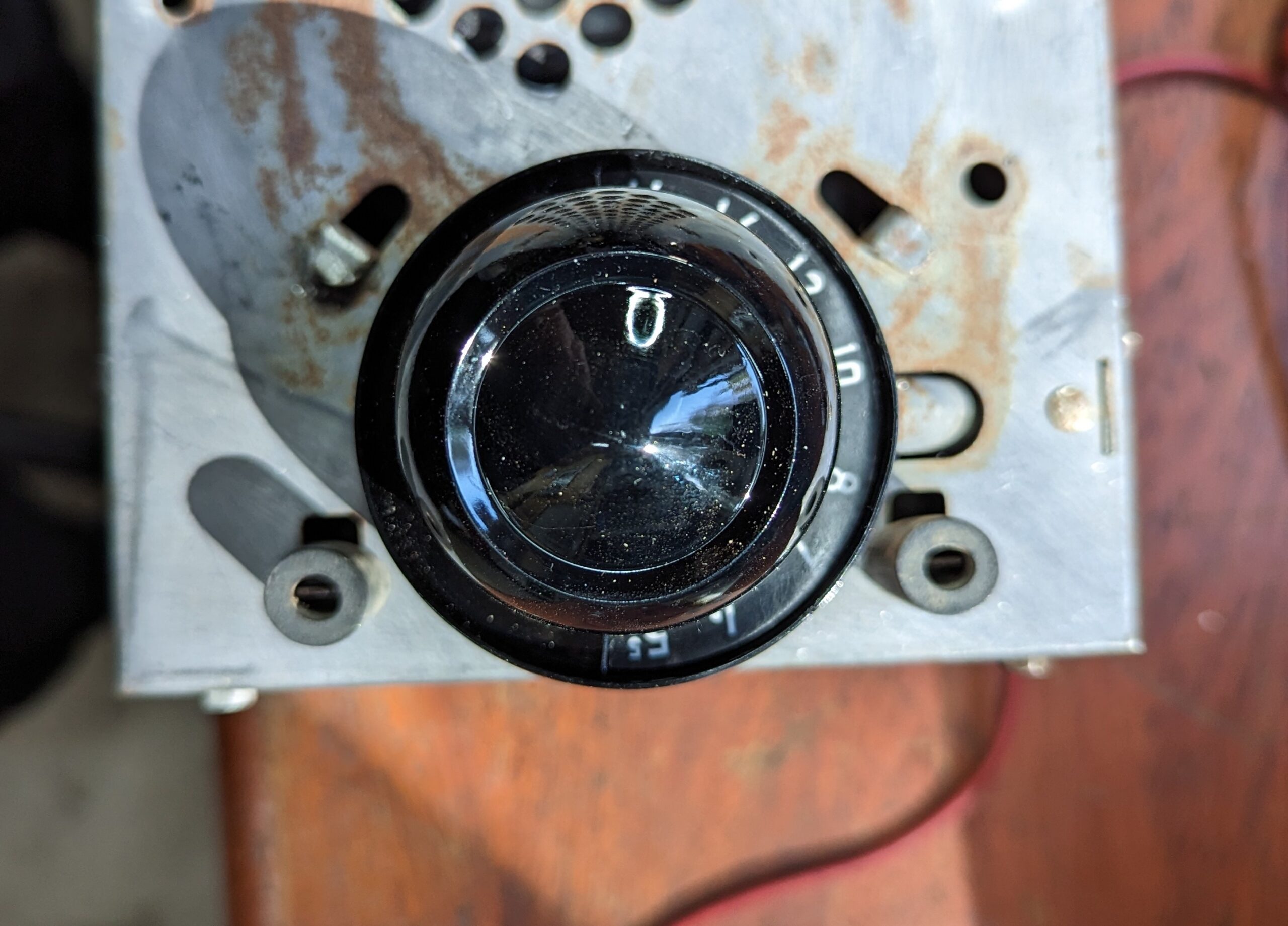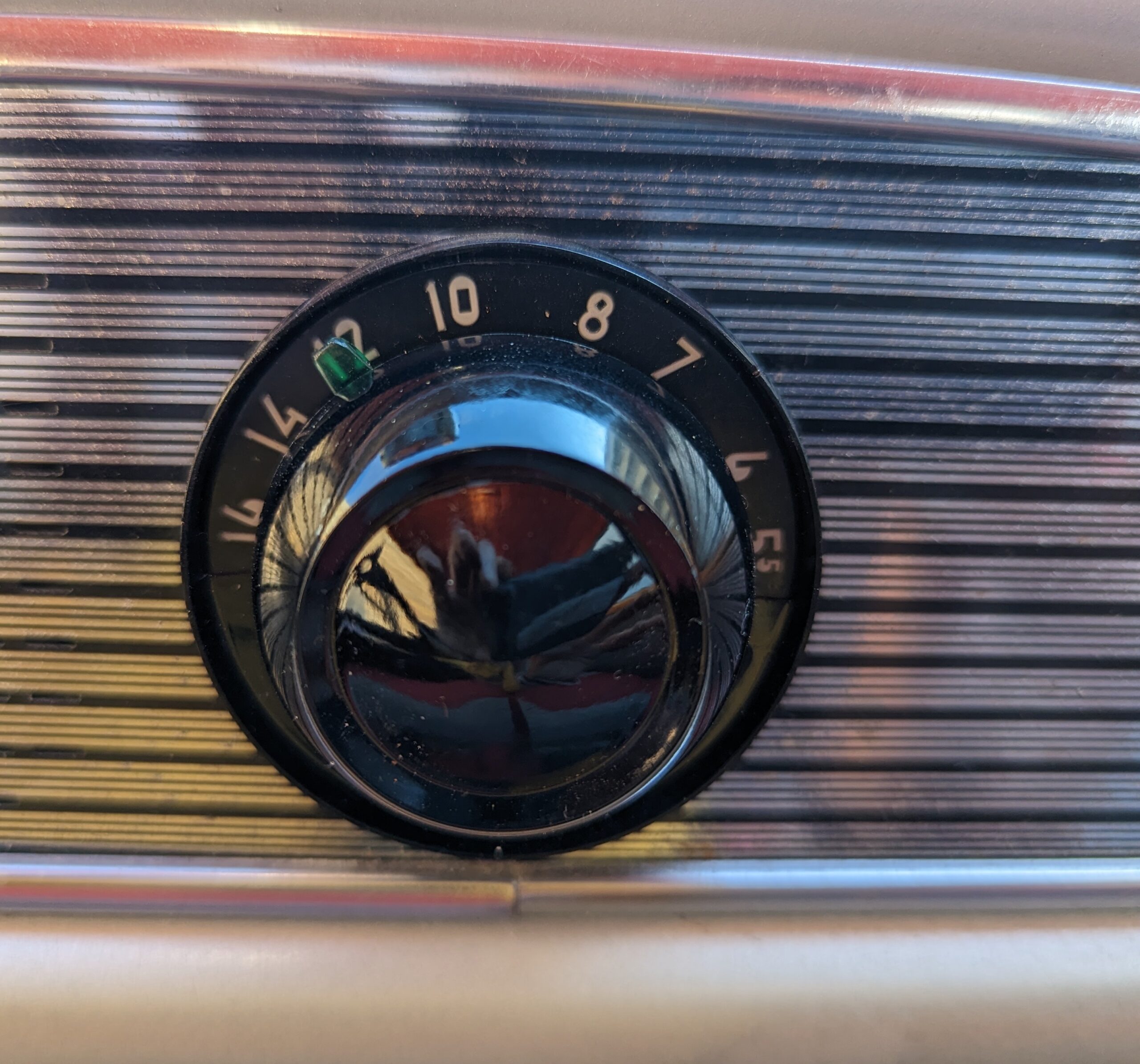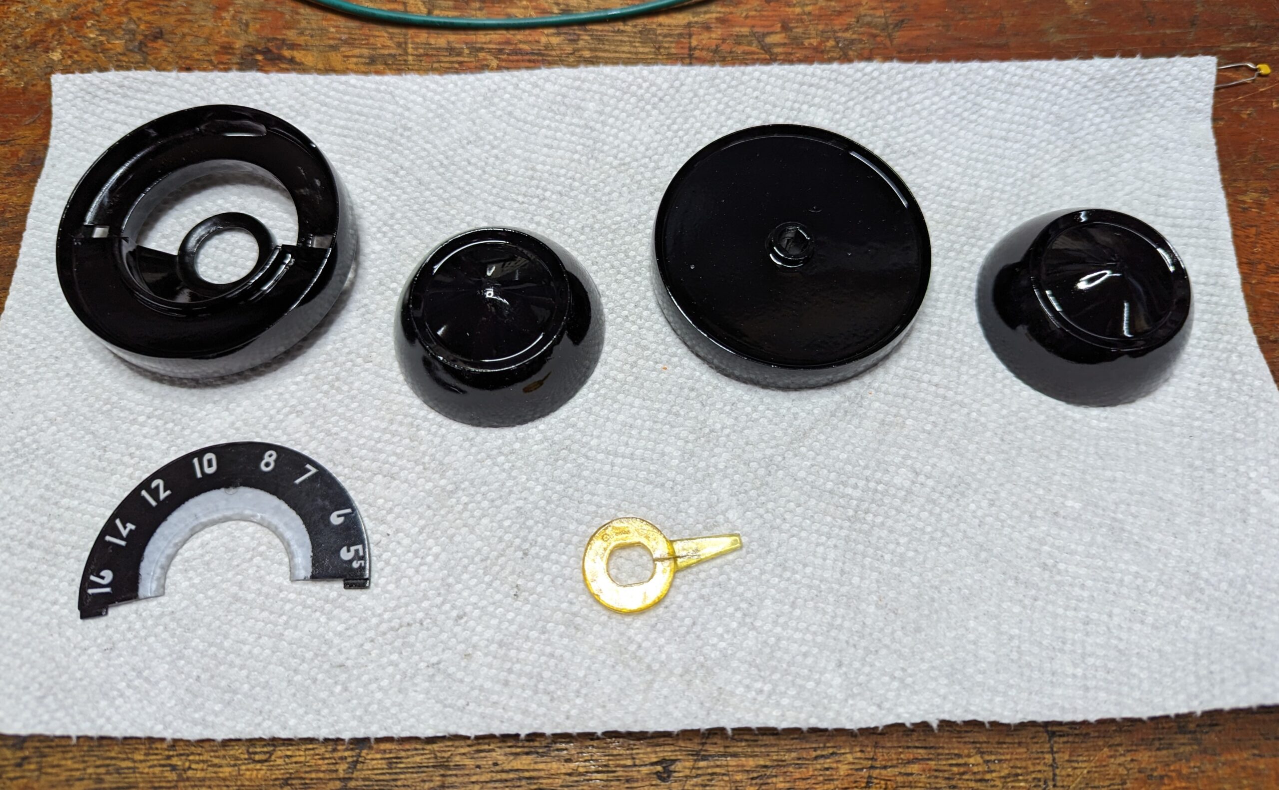 My friend Bruce gave me a set of knobs and parts he had. The selector dial parts were near-junk, and these were the best he had. The knobs are made out of cheap thermoplastic, they’re ancient, and sit out in the sun, and worst of all, the illuminated dial has a 2-watt filament lamp cooking it from the inside. This is why they are all warped, cracked, missing parts, and generally unusable.