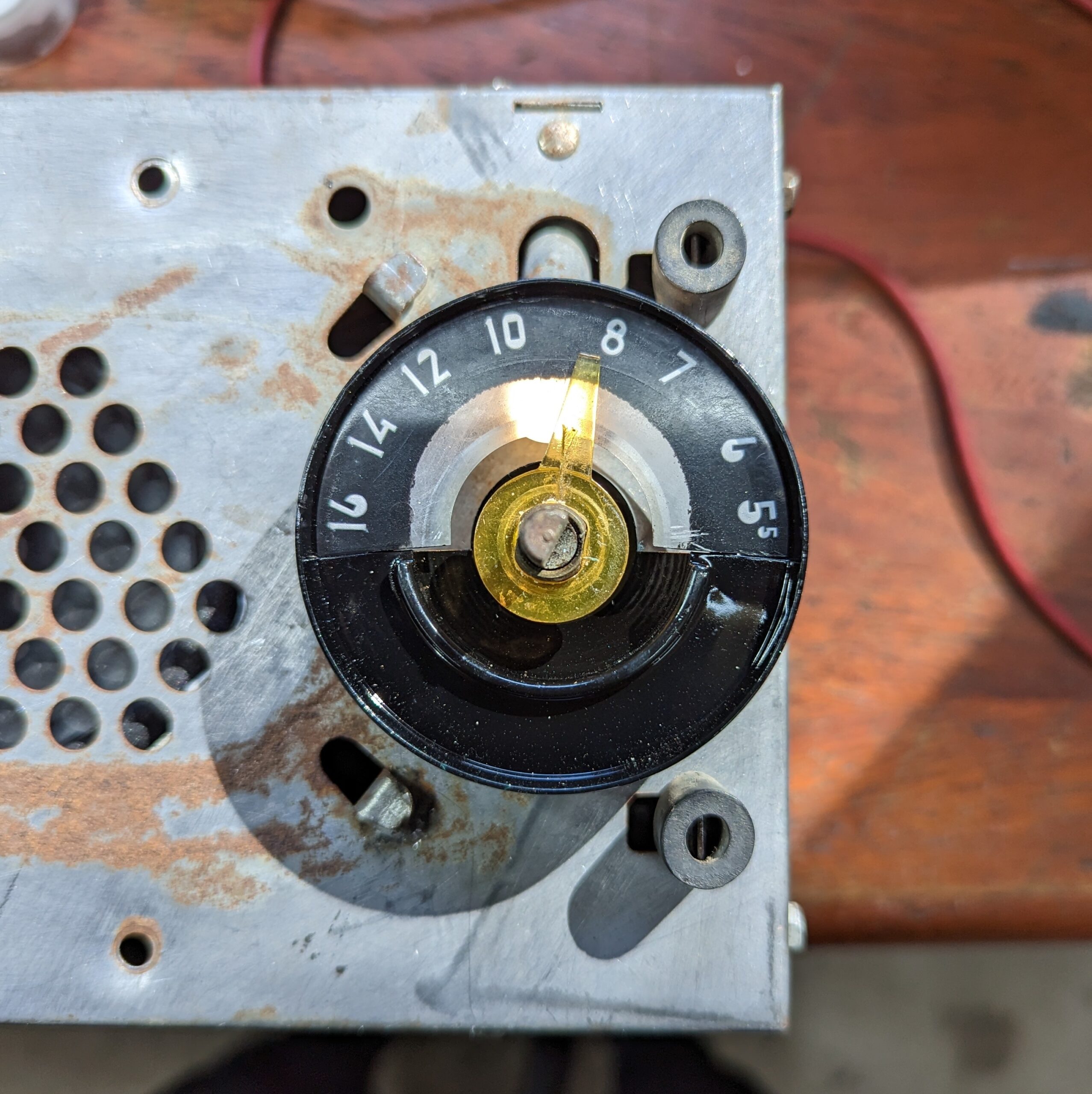 The yellow lucite pointer was intact but very ugly. I carved a new one out of clear lucite and affixed some green film I had. It needs redoing in yellow.