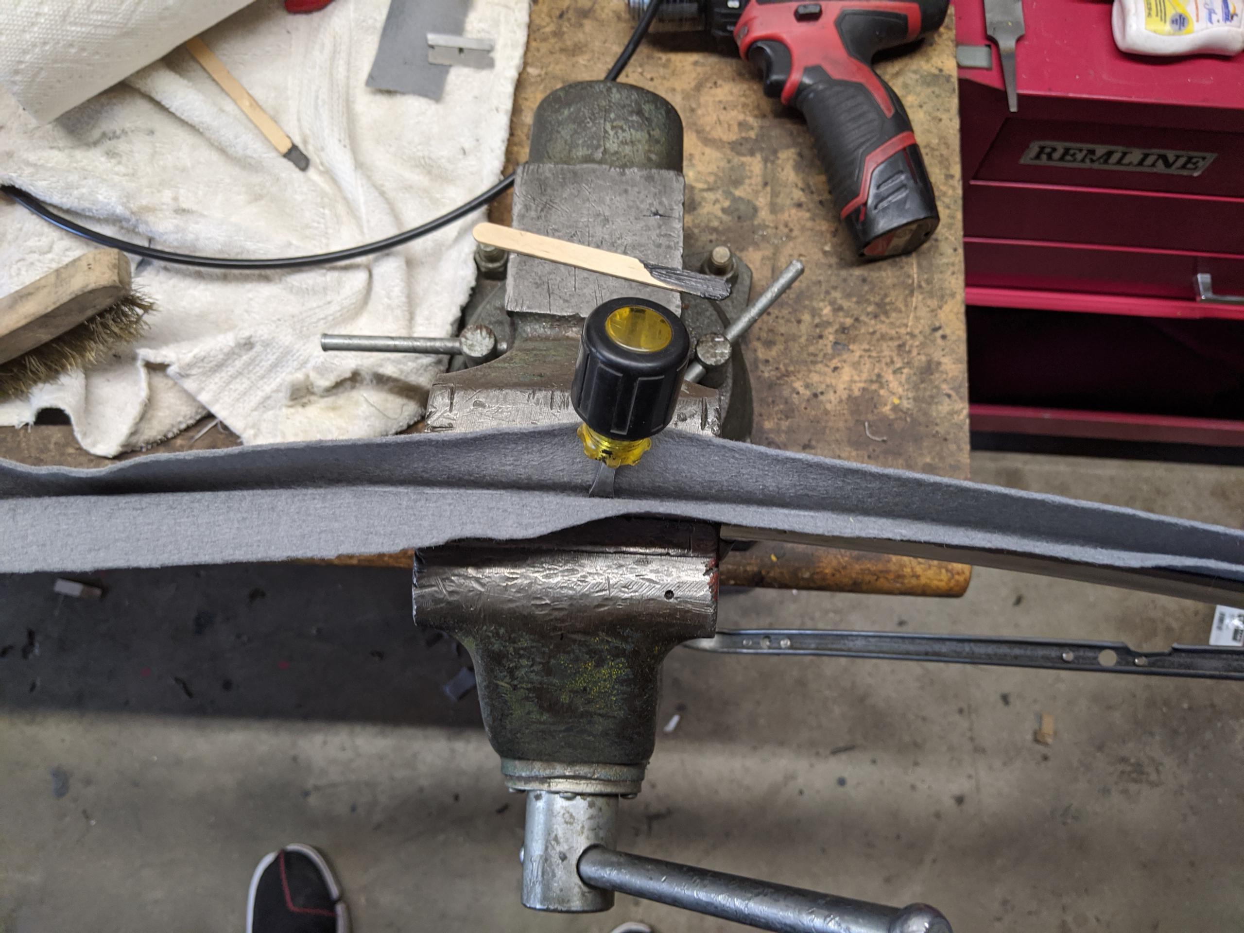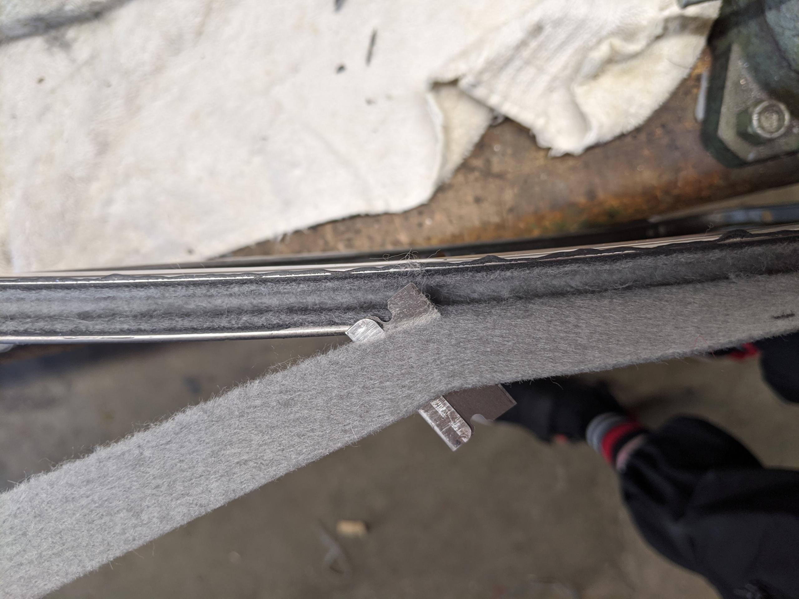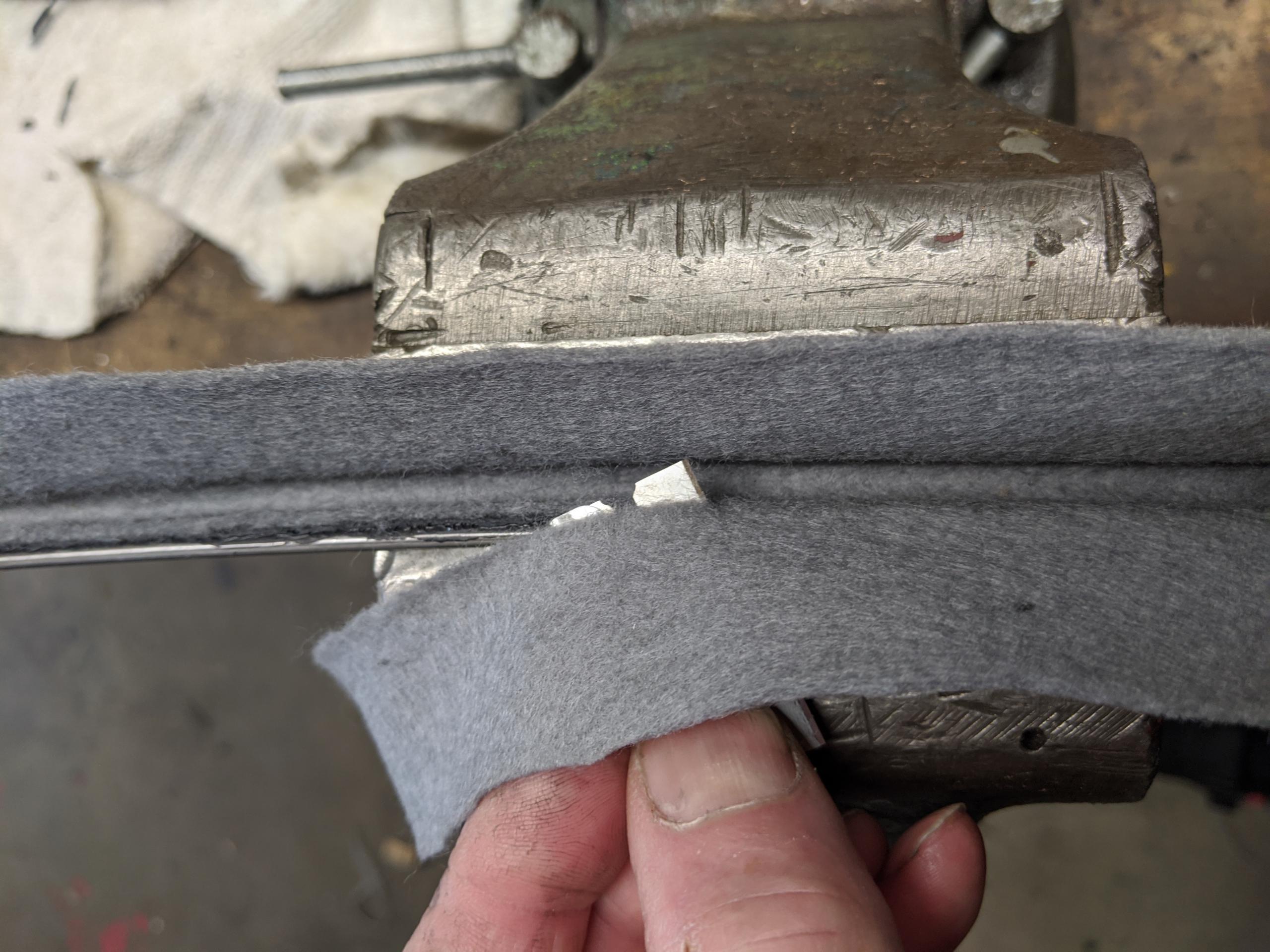 Tuck the felt into the channel. I had some 1/4″ hard plastic air line that was perfect for holding it into place. Doesn’t matter. Follow this with smoothing passes of a tiny screwdriver to tuck it into the channel. You don’t want baggy or loose spots.
