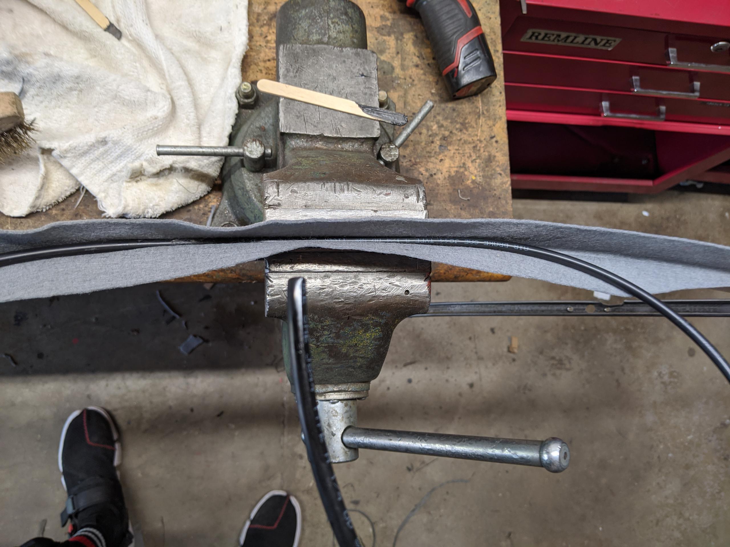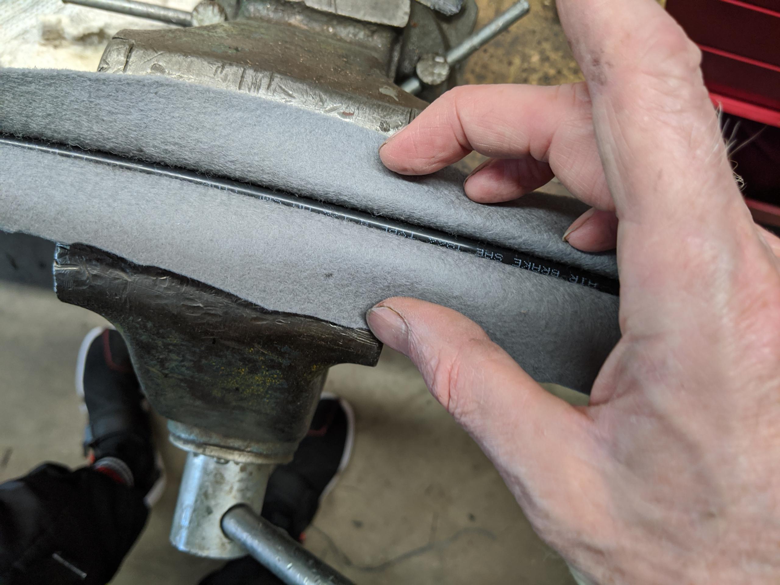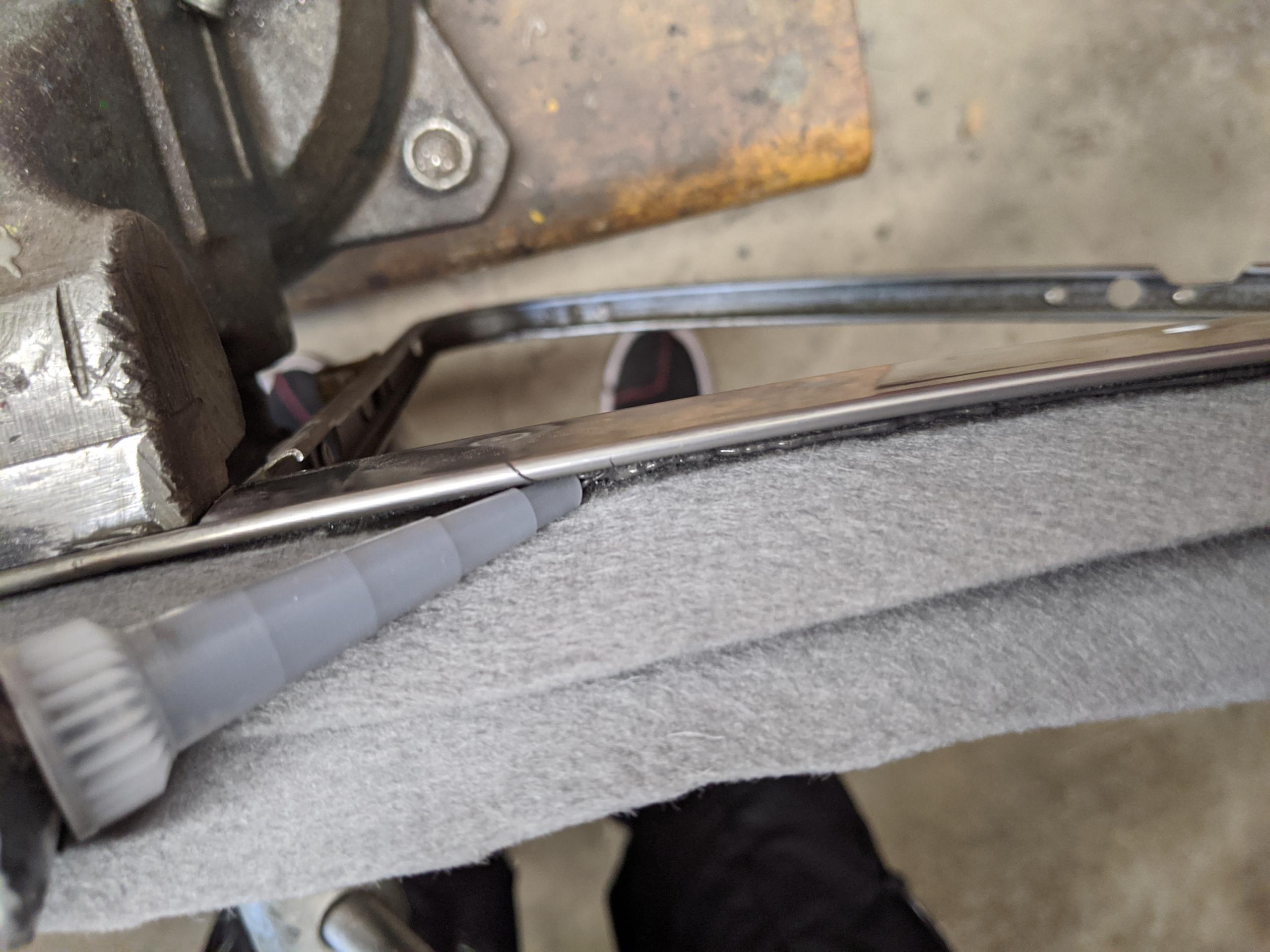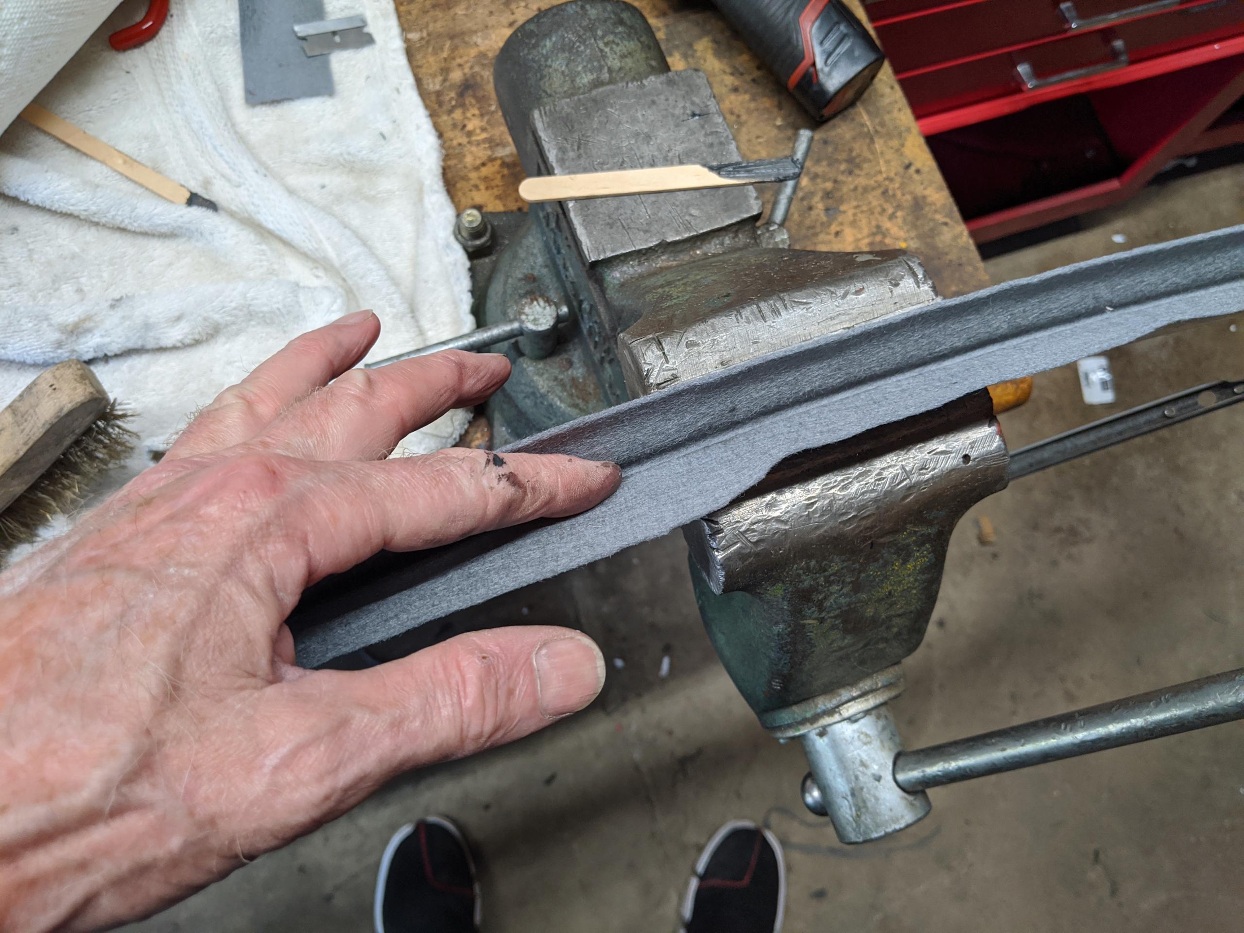 Tuck the felt into the channel. I had some 1/4″ hard plastic air line that was perfect for holding it into place. Doesn’t matter. Follow this with smoothing passes of a tiny screwdriver to tuck it into the channel. You don’t want baggy or loose spots.