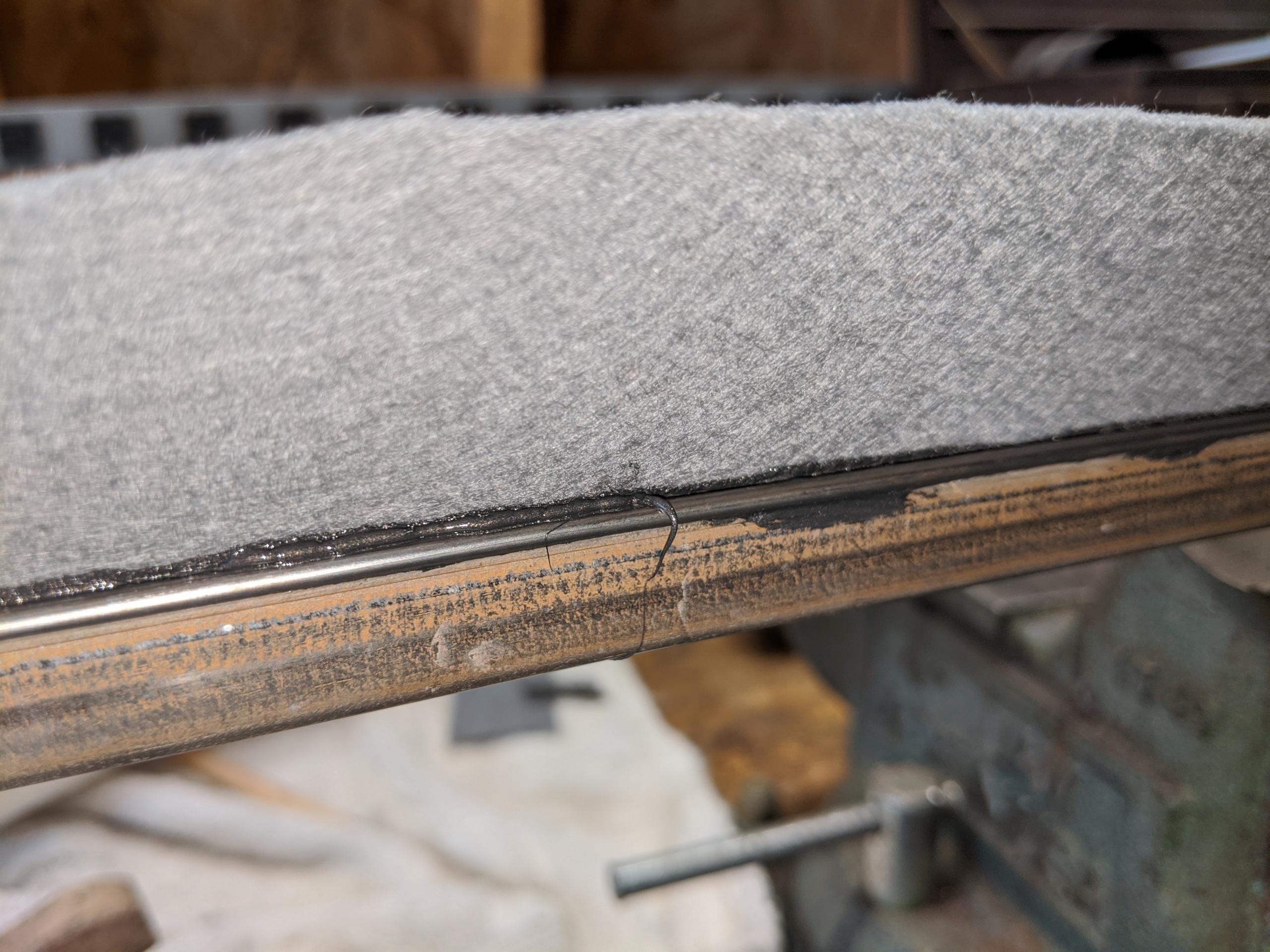 Using the smallest nozzle, apply a thin bead of goo between the top of the stainless bead and the felt. This was the hardest part — it’s hard to get a thin even bead, but perfection isn’t required; but you don’t want gaps. A bit extra won’t hurt. Resist the attempt to clean up the edges while uncured, you’ll only make a mess.