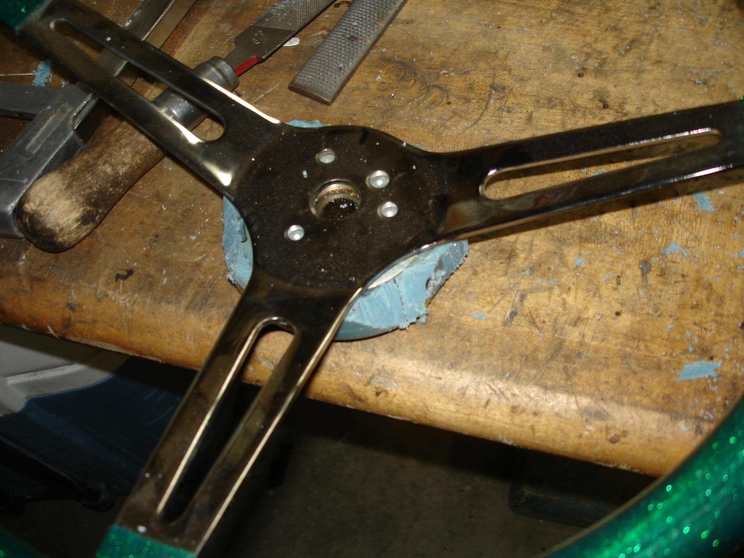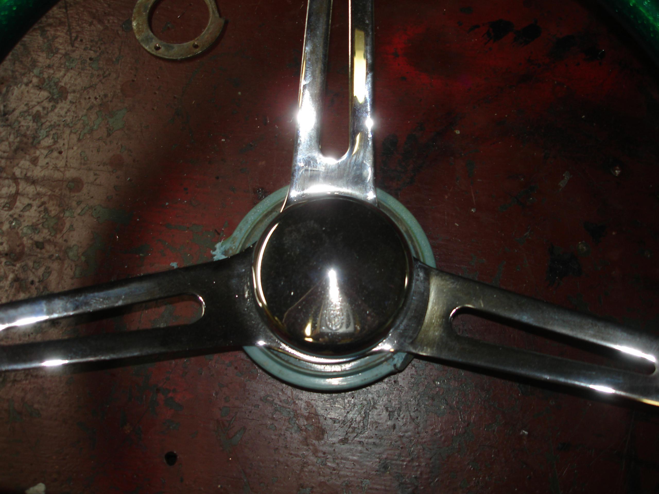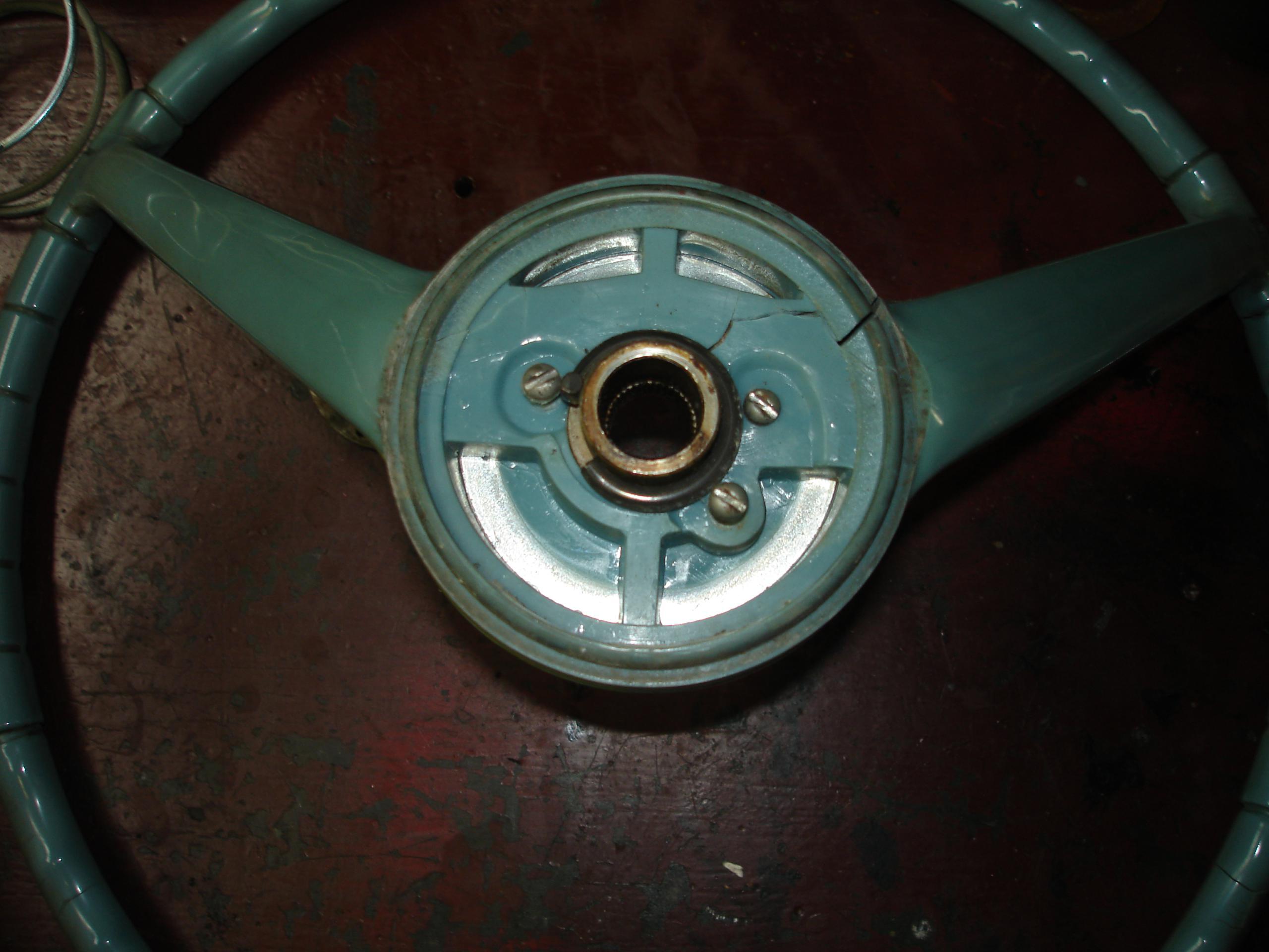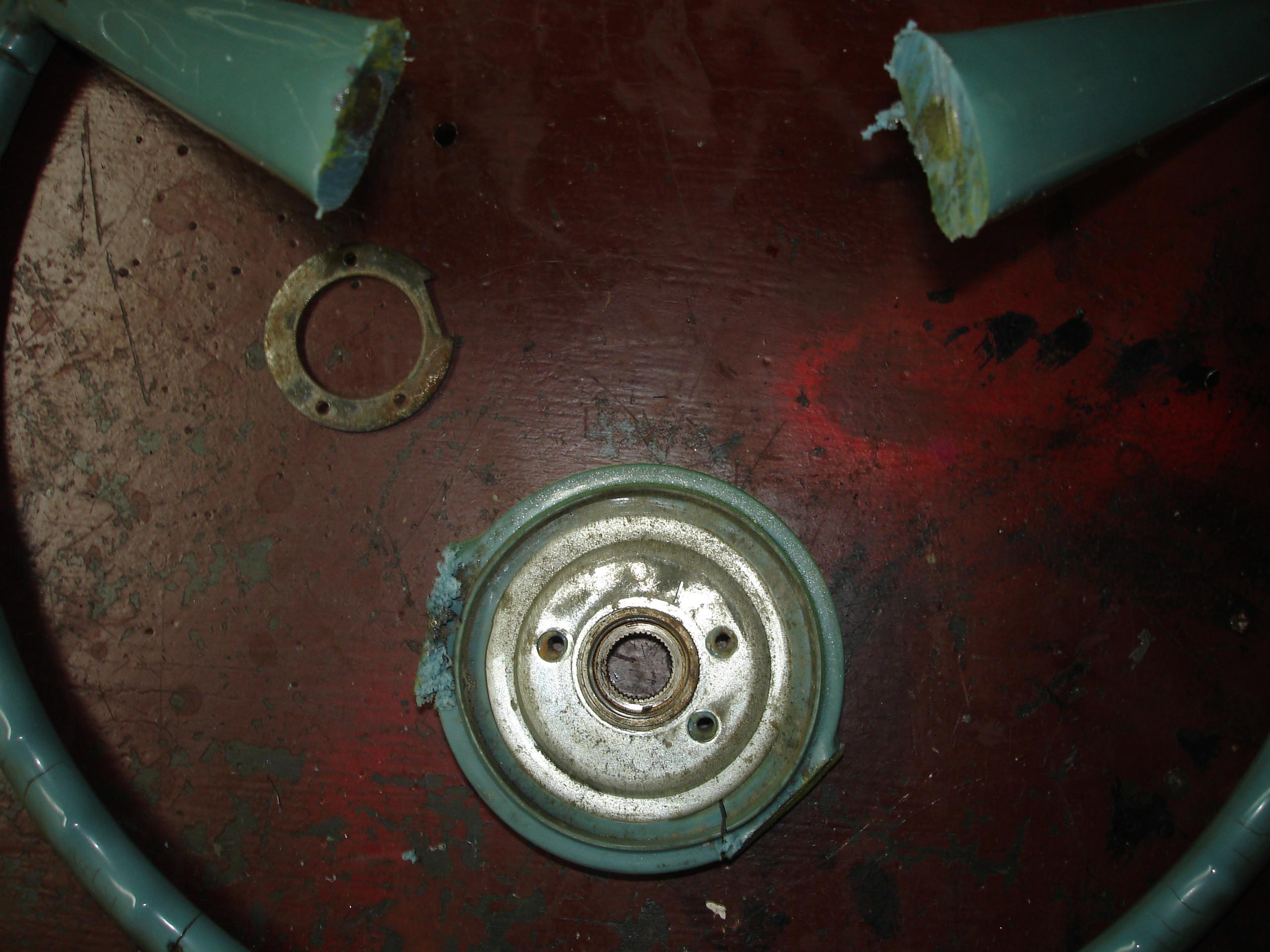 I originally tried to hack up the stock wheel, to use the hub as an adapter. Didn’t work. Basically it’s all molded plastic around a welded wire structure, with a small splined center. Photos are included below. The wheel was ruined, but it was badly cracked anyways. This is the method recommended by Grant for a hard to adapt wheel, just doesn’t work well with this one. Grant is assuming the wheel was made to use a two or three bolt puller, not the screw in the center of the wheel Nash/AMC type the early American uses. You might be able to make it work though…