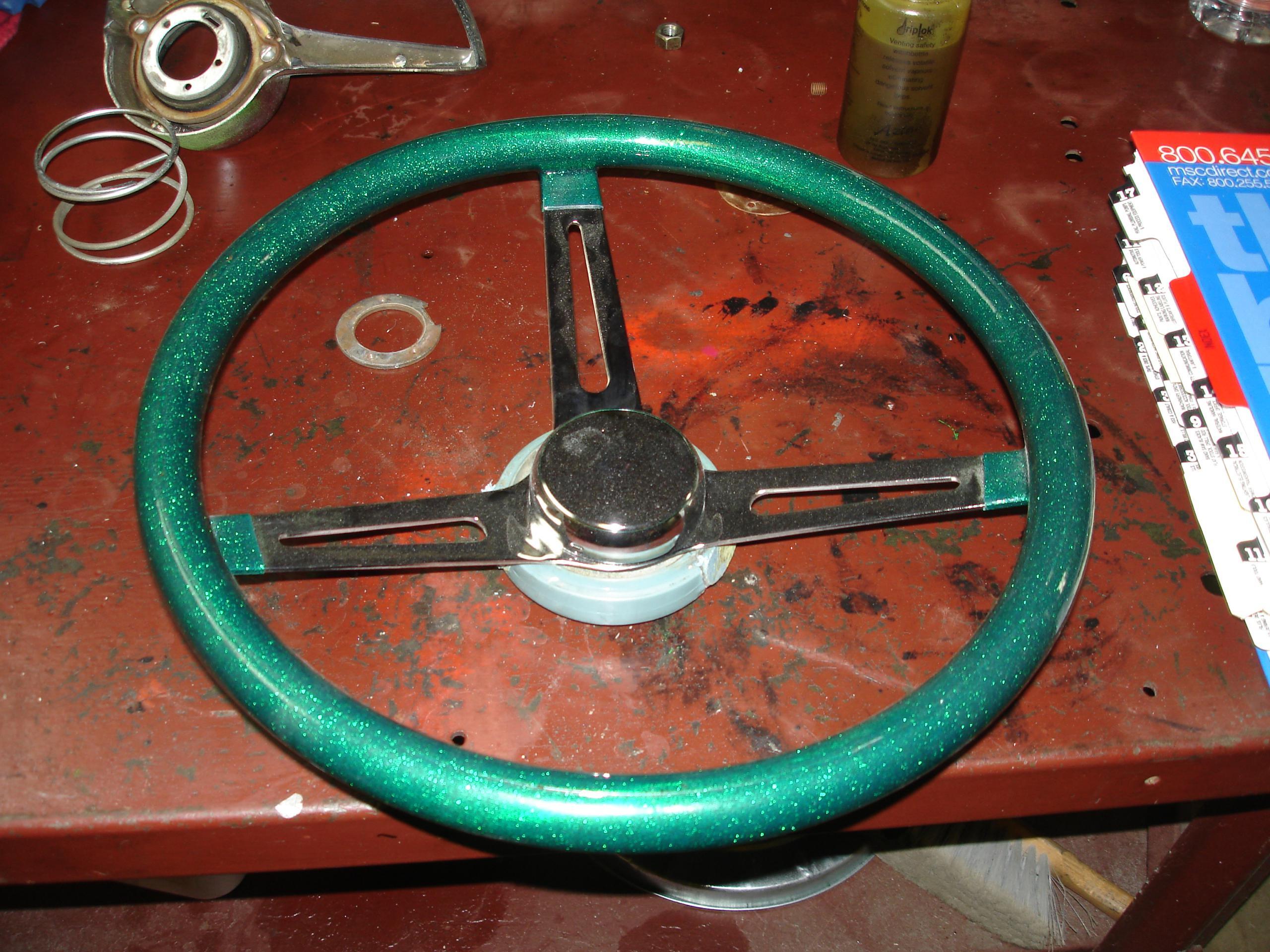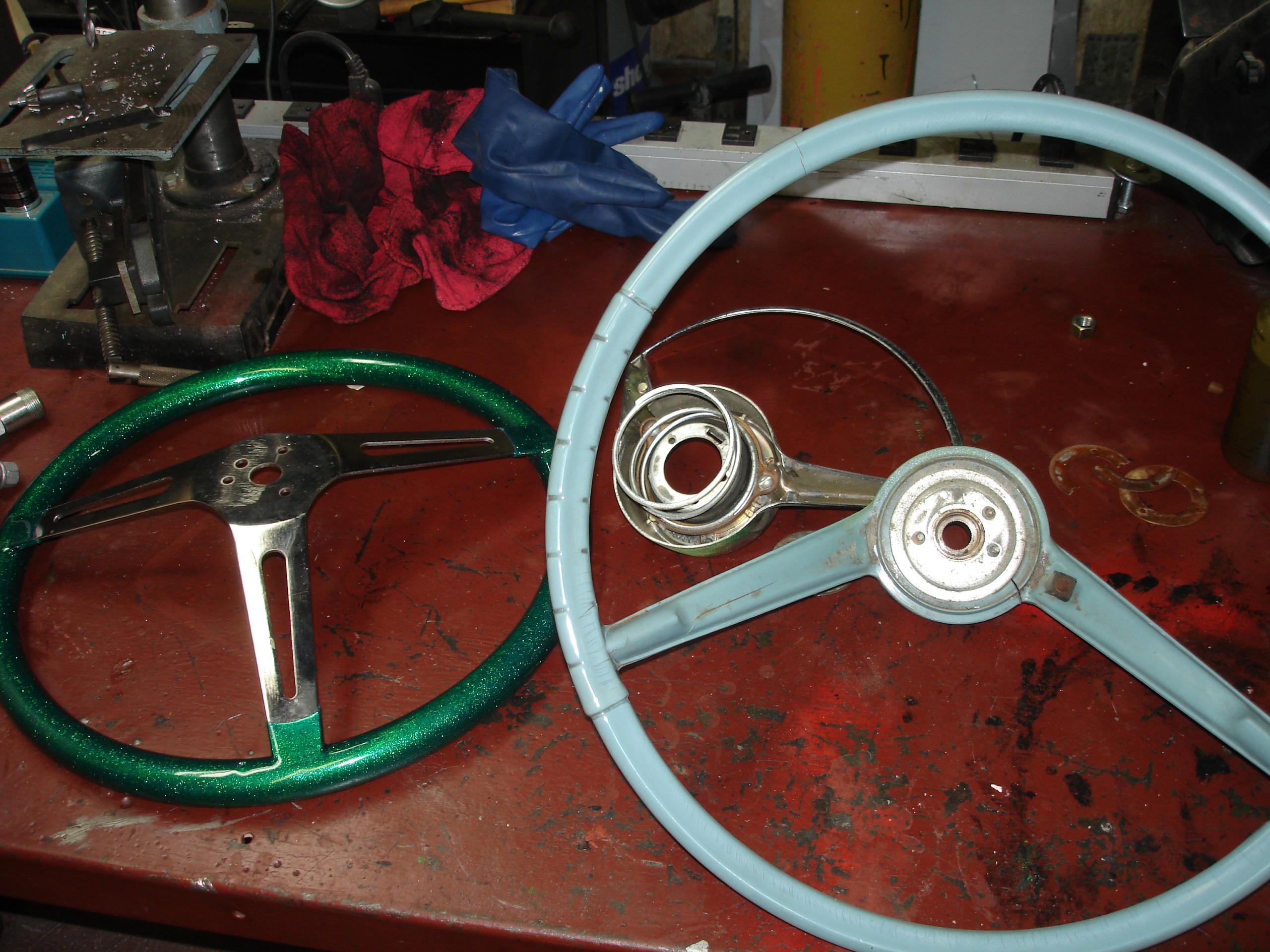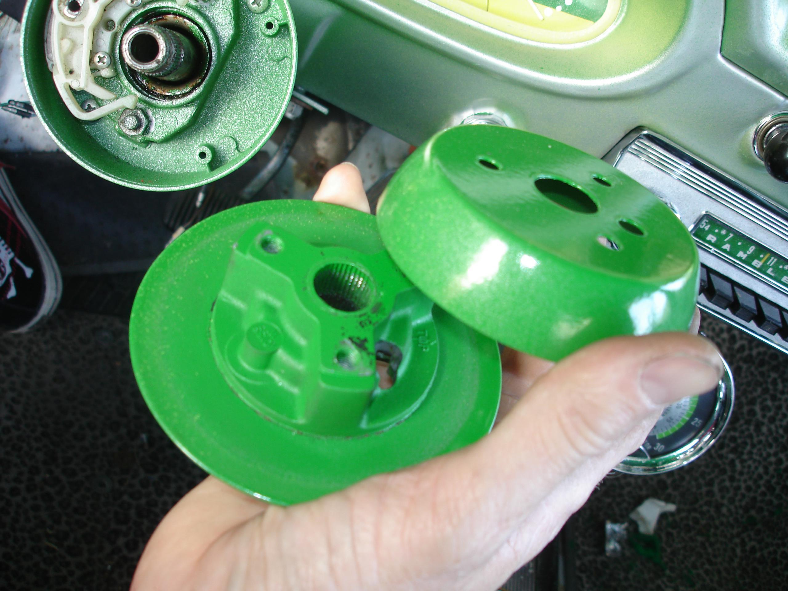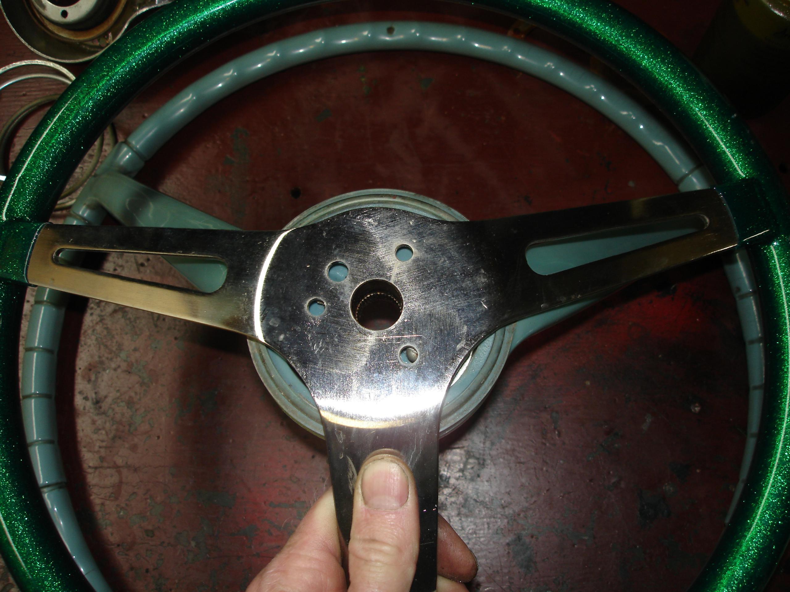 I originally tried to hack up the stock wheel, to use the hub as an adapter. Didn’t work. Basically it’s all molded plastic around a welded wire structure, with a small splined center. Photos are included below. The wheel was ruined, but it was badly cracked anyways. This is the method recommended by Grant for a hard to adapt wheel, just doesn’t work well with this one. Grant is assuming the wheel was made to use a two or three bolt puller, not the screw in the center of the wheel Nash/AMC type the early American uses. You might be able to make it work though…
