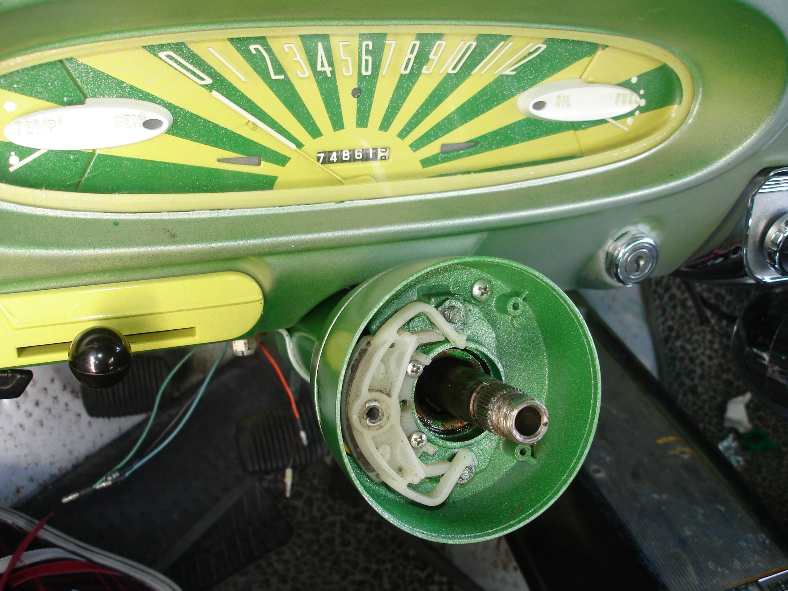 I also had to chop down the tall nut to fit the horn button. Horn wiring was easy, the American simply runs a wire down through the hollow steering shaft, through the box, and I just crimped on a female bullet connector.
