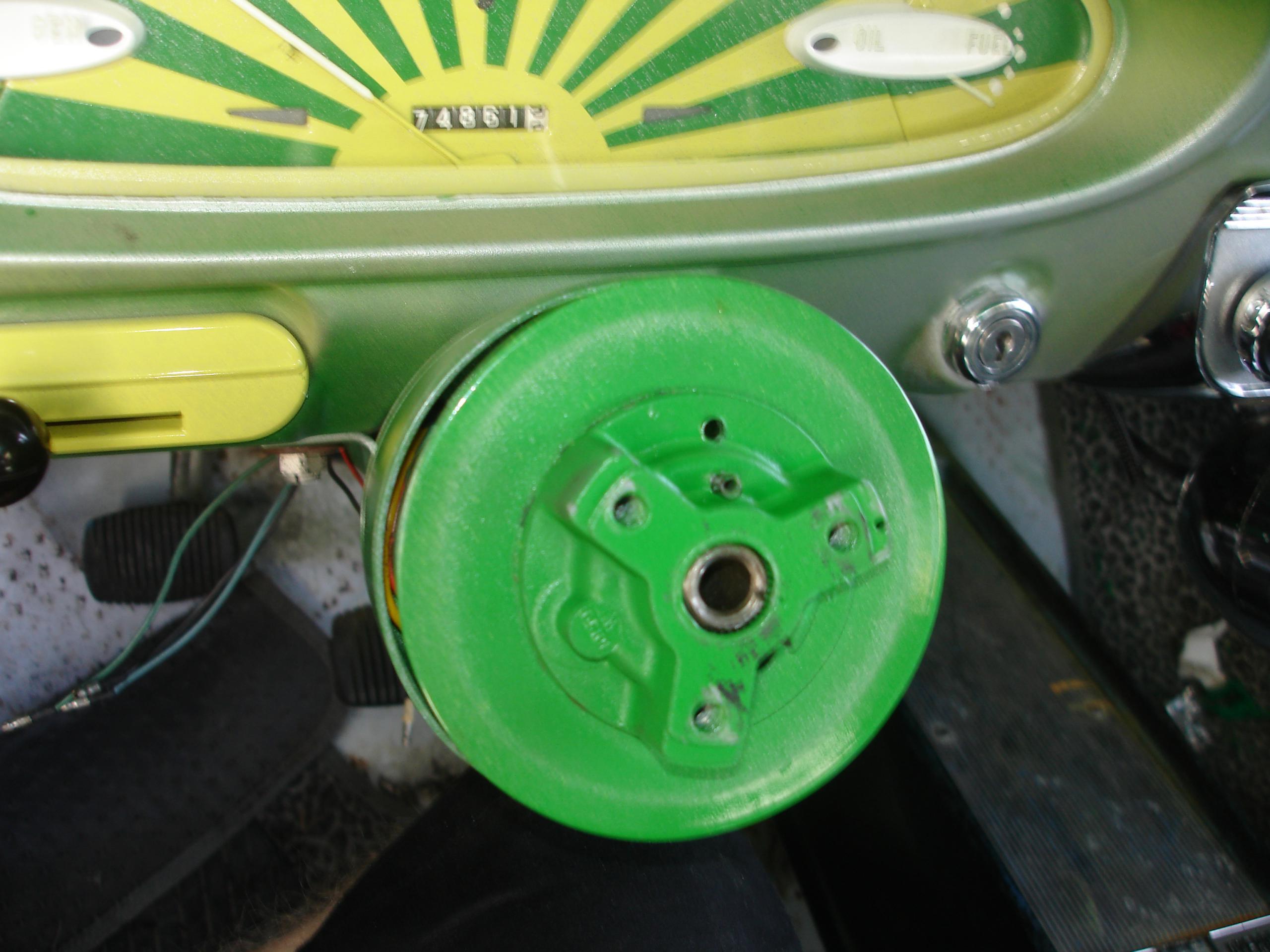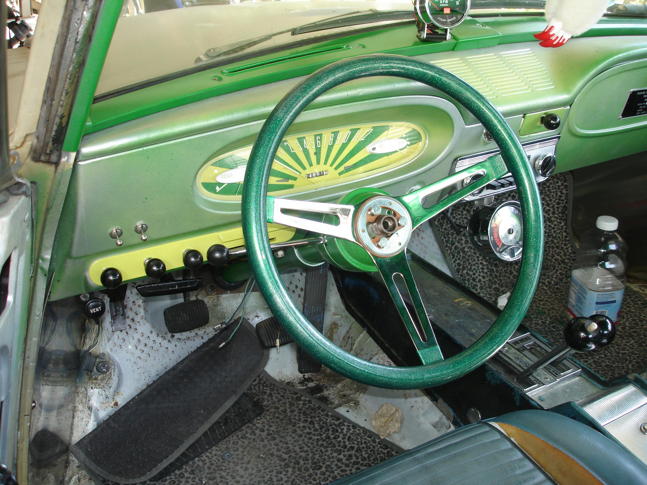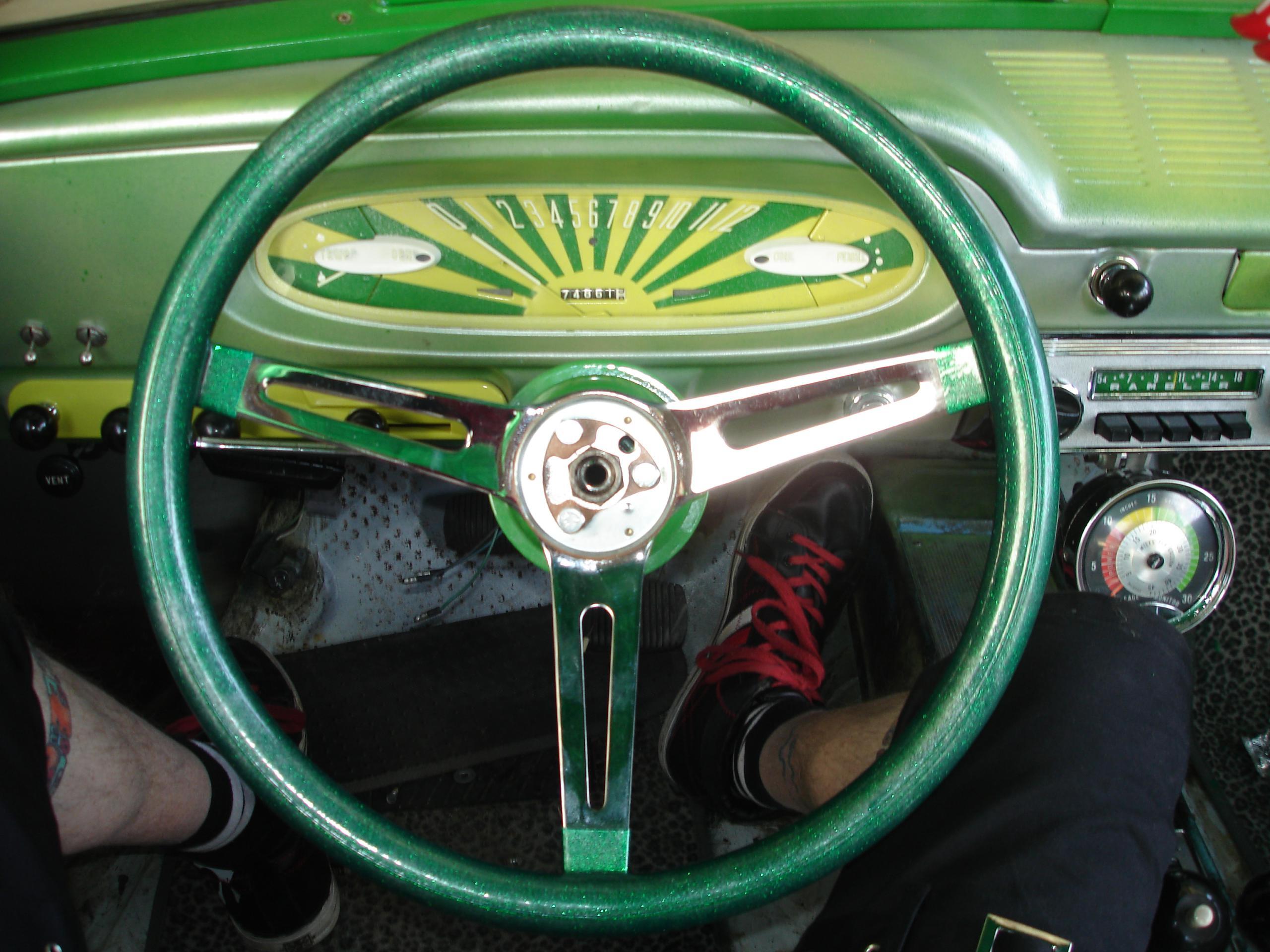 What can I say, it’s a steering wheel. This one is a 15″ Mooneyes special 60’s metalflake wheel, made by Grant. No one makes an adapter specifically for early AMC/Ramblers with Gemmer steering boxes, but long ago I managed to figure out that Grant adapter #10159 fit the splined shaft just fine. I had a 15″ (black) Grant on my 63 Classic, where it obscured the gauges and made difficult steering even harder; I yanked it off and gave it to AMC-lister Mark. Years later when I started this car Mark sent it back to me!